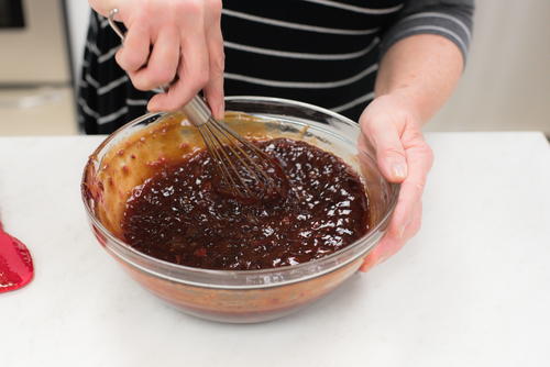 Stir together grape jelly, BBQ sauce, and chili sauce in separate bowl until thoroughly blended.