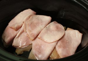 3. Lay 2 slices of ham over the top of each chicken breast.