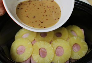 4. Layer 2 pineapple rings on top of the ham on each breast.