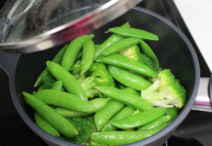 8. Cook rice in a sauce pan, and steam broccoli and pea pods in another.